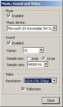 Click 'Music, Sound and Video' button to open 'Music, Sound and Video' window. Ensure, that 'Voices' are set to maximum value, 'Sample Size' is set to '16 bit' and 'Sample Rate' is set to maximum, supported by your sound card. Select the most suitable video resolution supported by your hardware. Click 'Close' to return to main configuration menu.