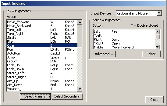 Click 'Input Devices' to open in-game controls configuration. Set up the keyboard/mouse controls here. Click 'Close' to return to main configuration menu.